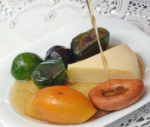 Es una combinación de varios ingredientes… todos igualmente deliciosos. Se compone de desamargado de lima y/o limón, brevas en almíbar y dulce de papaya.